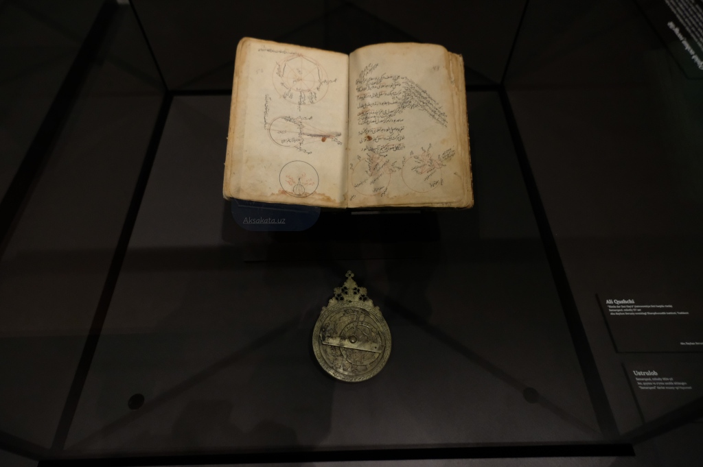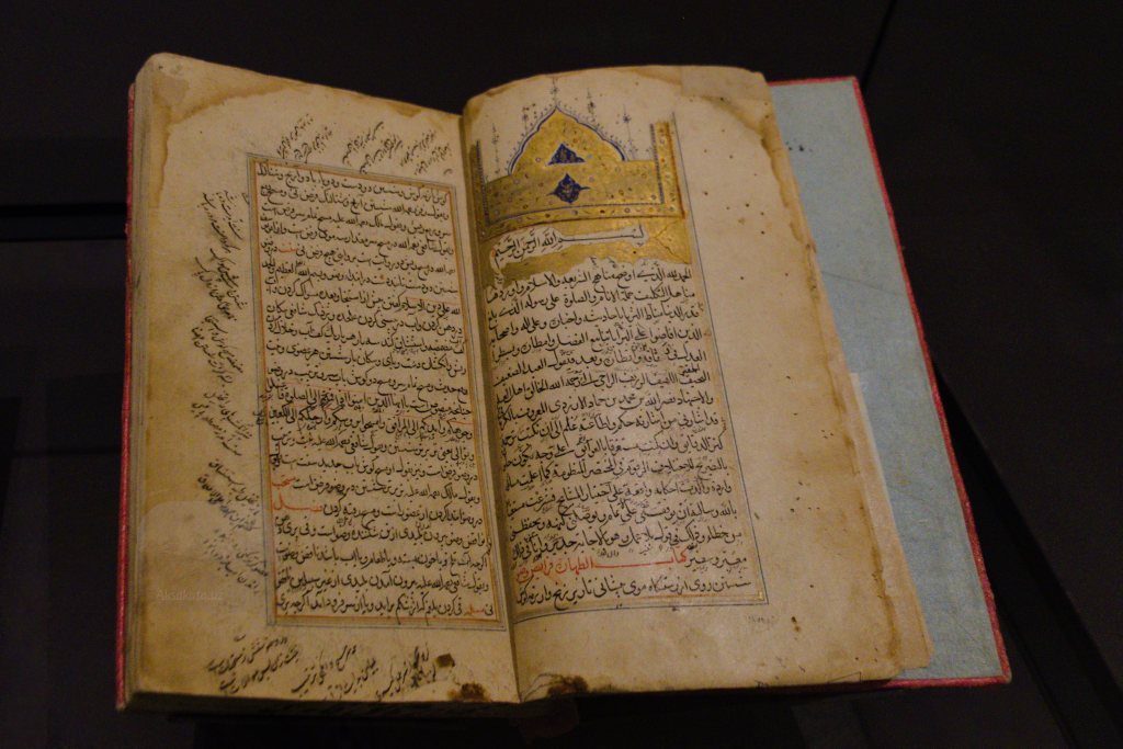 Под высокими сводами внутреннего помещения расположена историческая экспозиция. В скудном освещении можно увидеть причудливую каллиграфию арабской вязи. Примеры письменных принадлежностей того времени. Есть и астролябия. Это инструмент для определения широты и долготы небесных тел, полезный для астронома, а также в навигации и мореплавании.